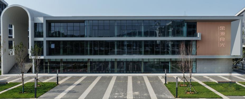 金源食光餐厅位于学院一期北区,与学生宿舍楼、教学楼、图书馆相邻,共三层,建筑外立面采用玻璃幕墙和仿木纹陶板结合的建筑风格,整体建筑大气磅礴,总建筑面积达1.5万平方米,是一座以“多元、健康、科技”为核心理念的现代化餐厅。