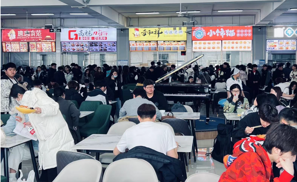 金源食光餐厅不仅仅是一个可以满足果腹需求的场所,更是师生在忙碌间隙放松身心、享受片刻闲暇的空间,设有图书天街、LED双面大屏,师生在茶余饭后可饱览群书,遨游书海,同时LED双面大屏为学生团建等活动提供了优质场景。