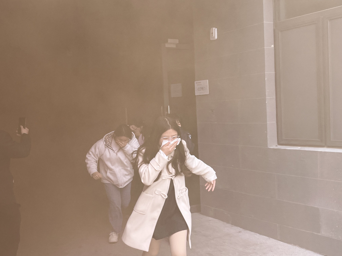 演练前期,辅导员老师通过主题班会、宿舍走访等多种形式,提醒学生牢记演练流程;演练当天老师们提前对各楼疏散通道、安全出口进行拉网式排查,确保疏散路线全程畅通;12:40演习正式开始,宿舍内的学生们迅速反应,立即按照既定流程,迅速起身、湿毛巾捂住口鼻,保持弯腰低姿,沿着宿舍墙壁快速向门外撤离,沿着指定路线向安全集合点疏散。